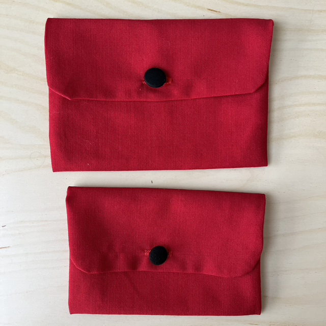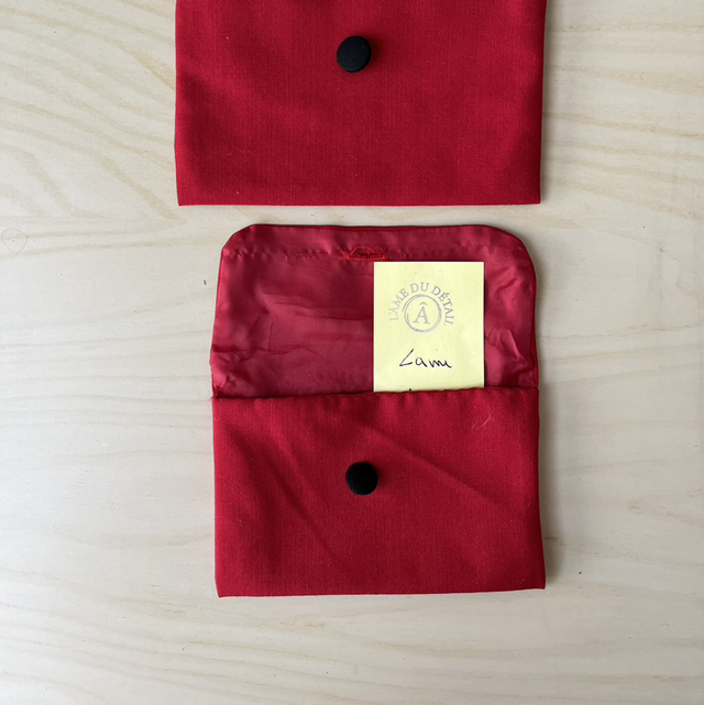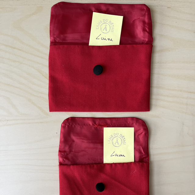 Deux belles enveloppes en laine doublée acétate avec un bouton recouvert de tissu noir, pour y ranger des mots doux, des stylos, du maquillage. Bref pour garder “ un détail”