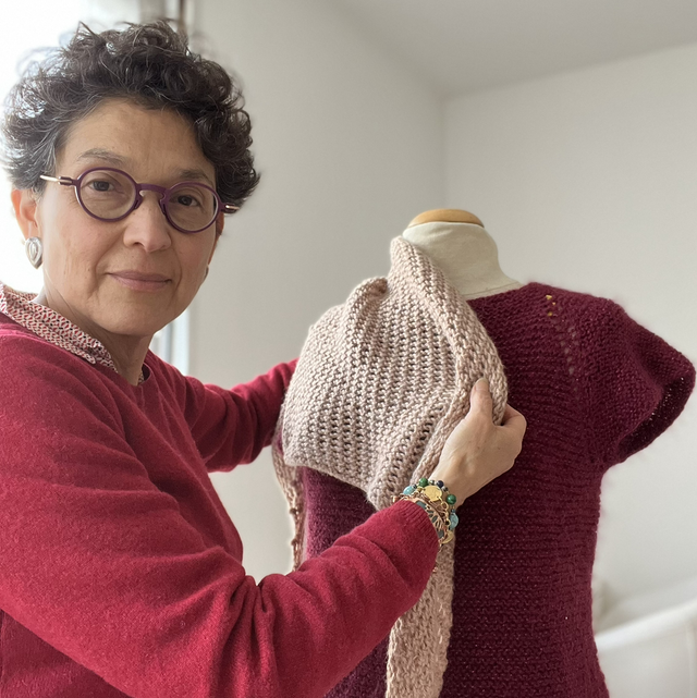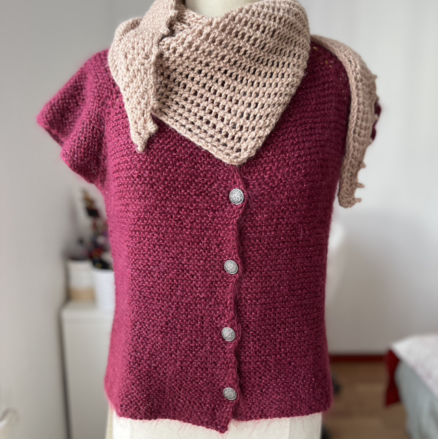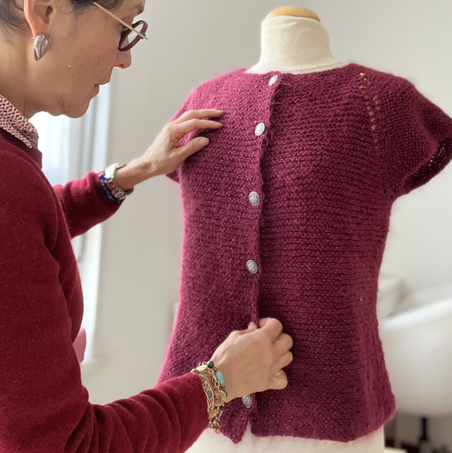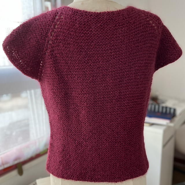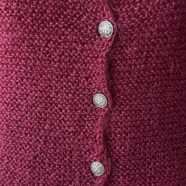 Petite veste tricotée main en “top down” au point mousse dans une belle couleur bordeaux avec un peu de lurex, juste ce qu’il faut pour attirer la lumière. Manches très courtes, boutons métal couleur vieil argent. Taille M, 40 cm d’épaules et 49 de longueur dos.