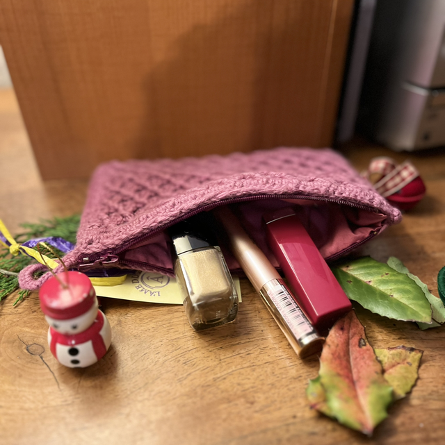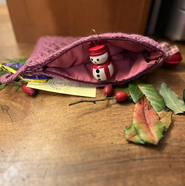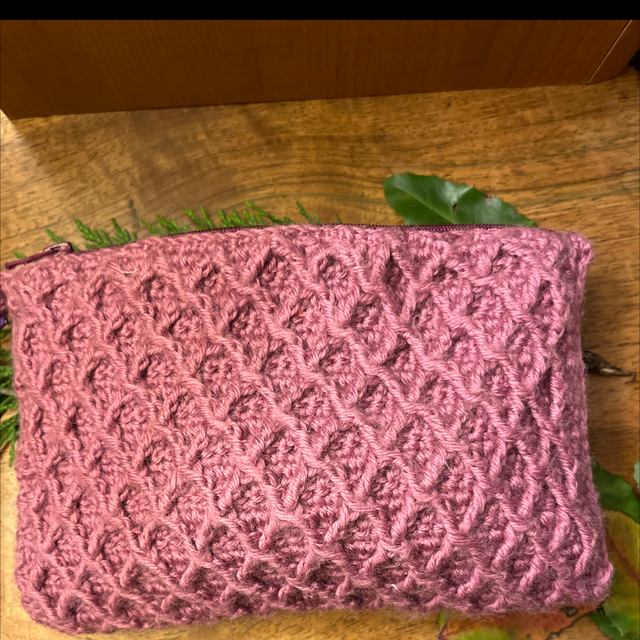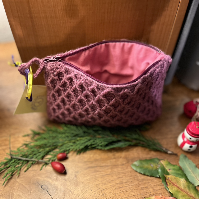 Jolie trousse crochetée main dans des tons lilas, doublée.